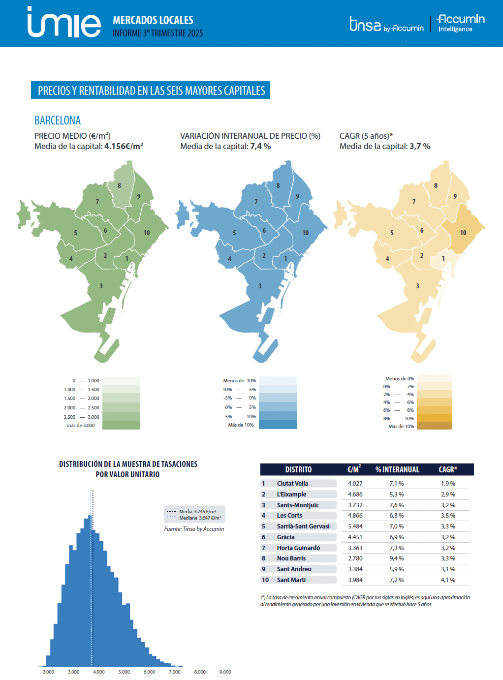 Le prix de l’immobilier à Barcelone depuis le début de 2025 s’établit à 4.081,72 €/m2 selon le site de la mairie de Barcelone: données obtenues à partir des registres des notaires de la ville de Barcelone.