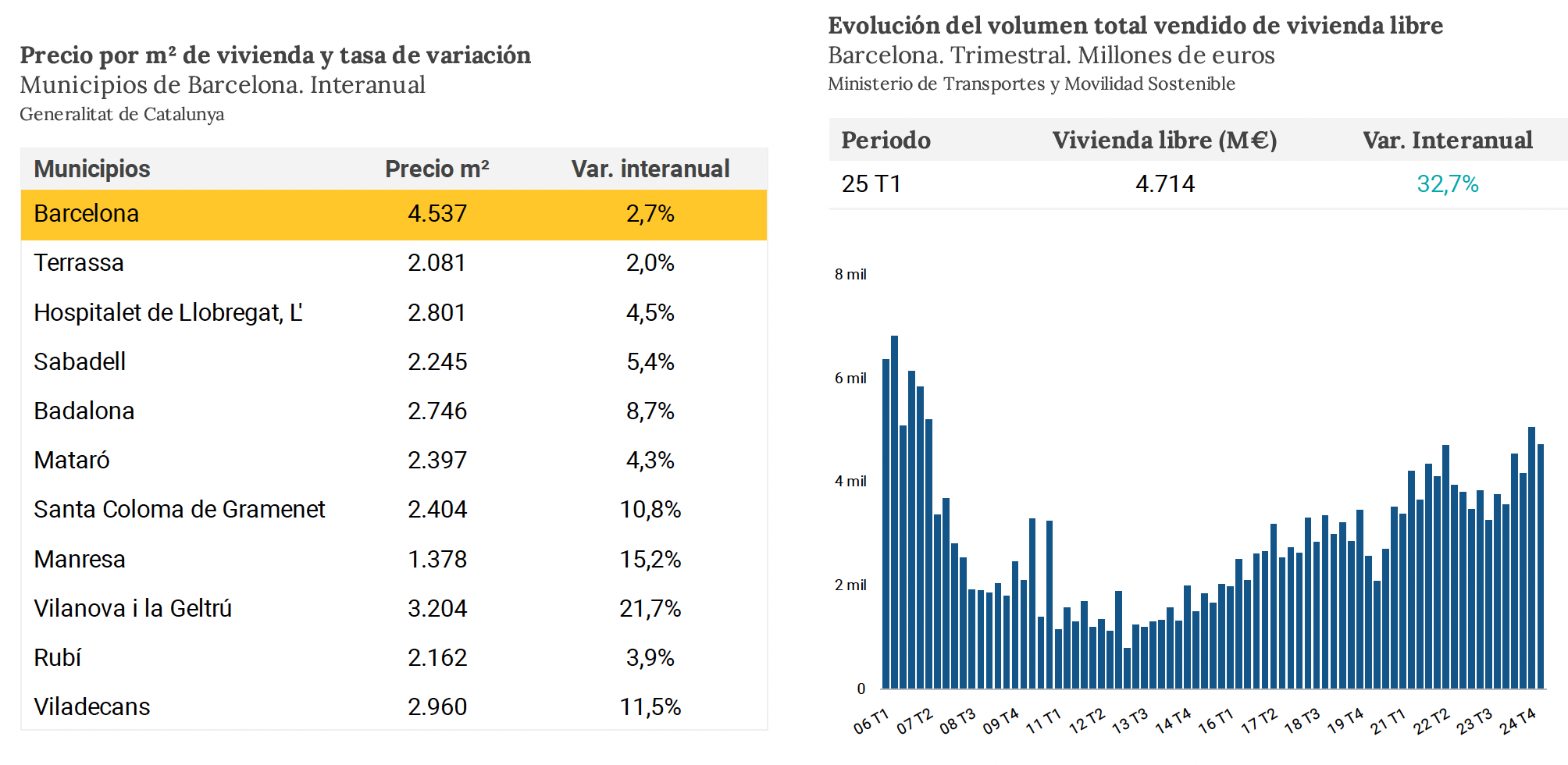 Une étude d’octobre 2025 de l’Observatori Metropolita de l’Habitatge de Barcelona met en exergue ce phénomène. Entre 2000 et 2023, le revenu moyen des ménages a augmenté de 87,8 % et le prix moyen des loyers a augmenté de 178,3 %. Pour 2025 le prix d’achat des logements continuera à augmenter fortement. Il y a une forte tension sur le marché locatif à Barcelone. Il est marqué par une baisse significative de l’offre locative traditionnelle, en partie transférée vers la location saisonnière.