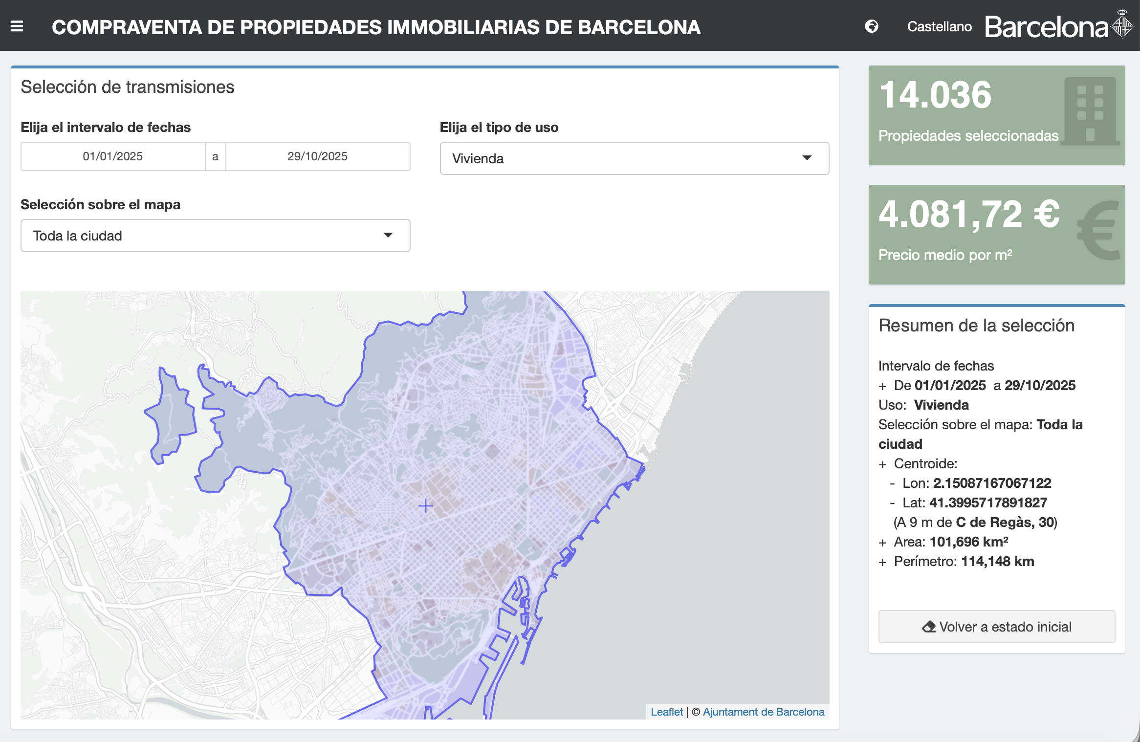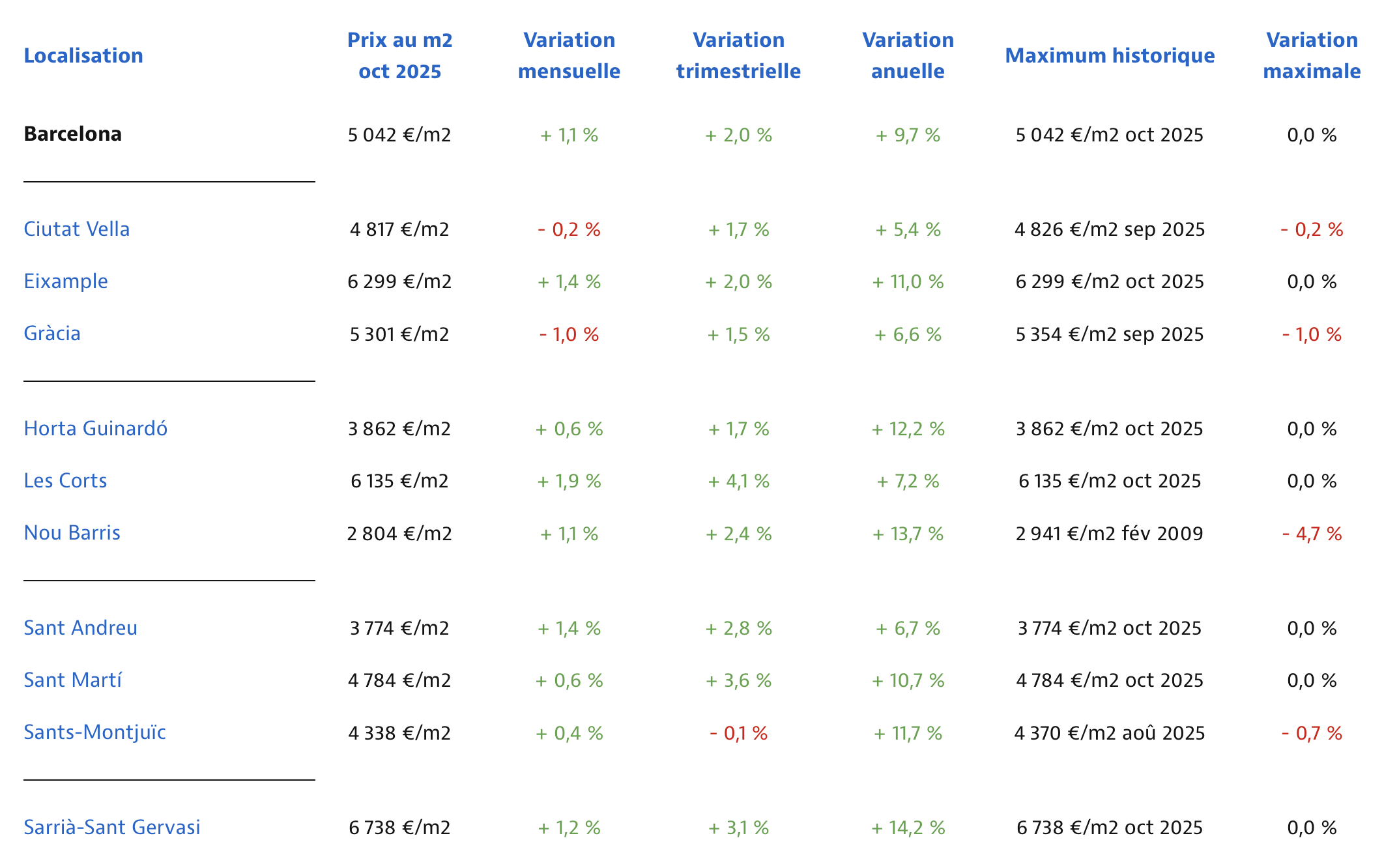 Le prix de l’immobilier à Barcelone depuis le début de 2025 s’établit à 4.081,72 €/m2 selon le site de la mairie de Barcelone: données obtenues à partir des registres des notaires de la ville de Barcelone.