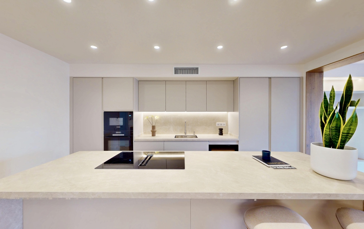 Grande salle à manger de 25,70 m² avec cuisine intégrée équipée d’appareils électroménagers de la marque Bosch, réfrigérateur, lave-vaisselle, cave à vin, four, micro-ondes et îlot.