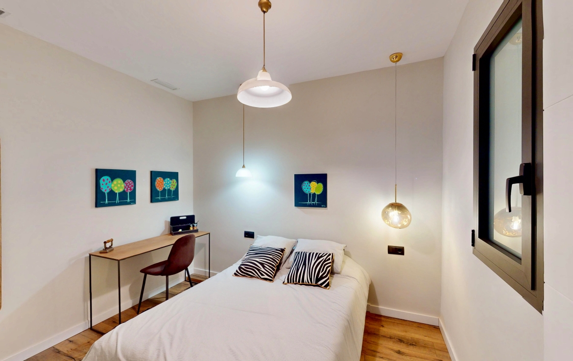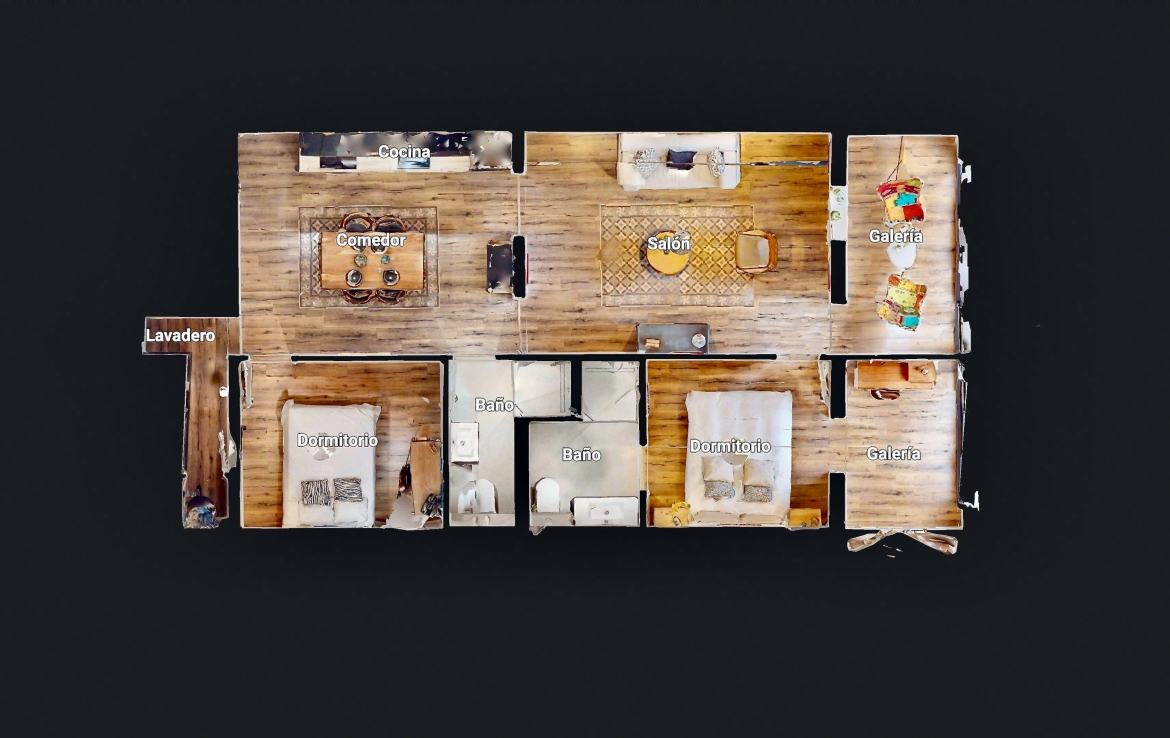 Il comprend un salon de 17,20 m² donnant sur une galerie de 7,05 m² avec grandes baies vitrées sur le patio de manzana, une cuisine ouverte avec espace repas de 15,53 m².
